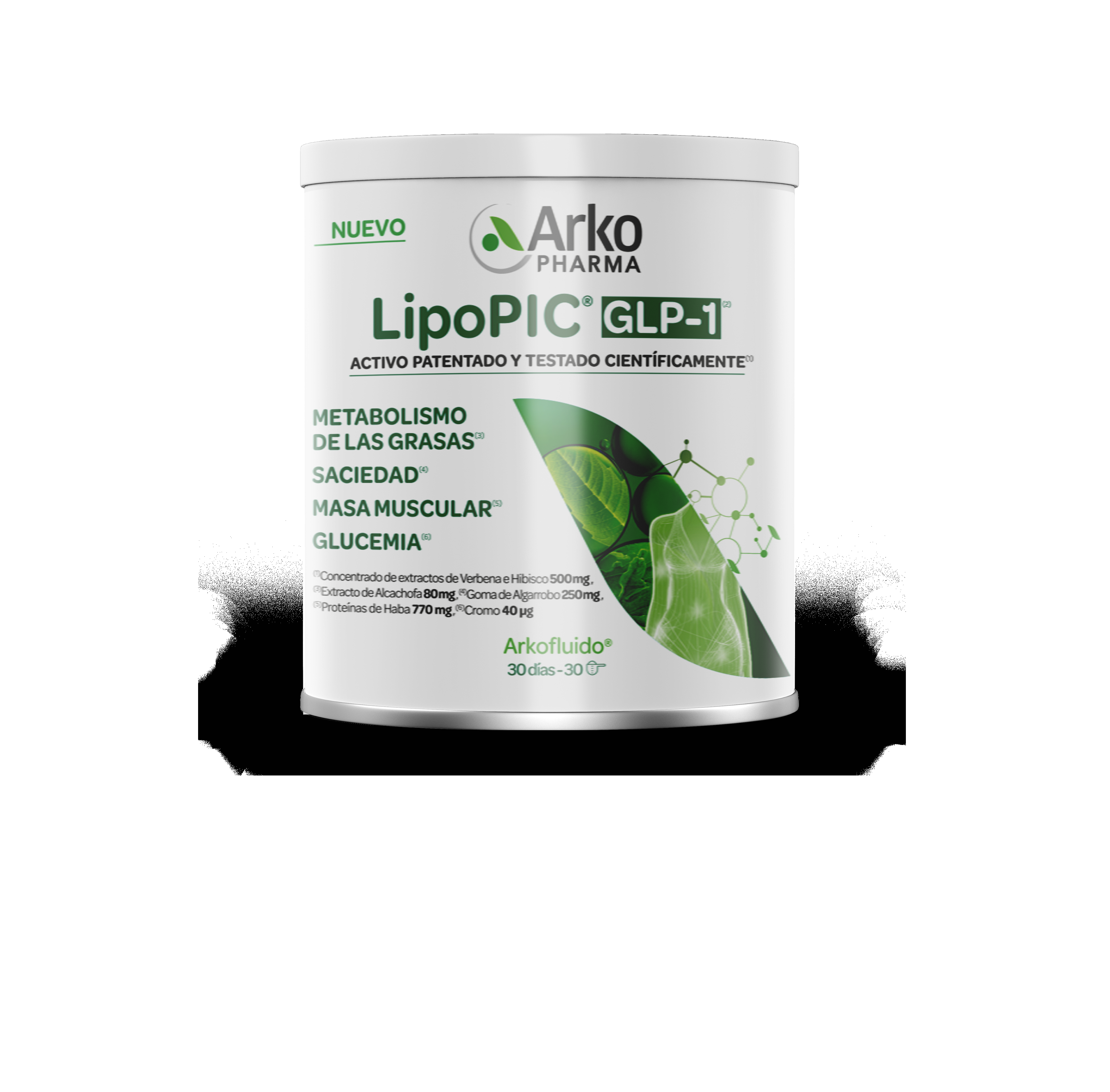 Arkofluido® LipoPIC® GLP -1® es una fórmula 100% vegetal y mineral, sin azúcares, sin conservantes, sin colorantes ni aditivos químicos y con sabor afrutado (fruta de la pasión y frutos rojos). Contiene Proteínas de Haba, concentrado de extractos vegetales de hoja de Verbena, y de flor de Hibisco; goma de semilla de Algarrobo; extracto de hoja de Alcachofa y cromo. Debe tomarse una cuchara rasa en un vaso de agua (200 ml), agitar enérgicamente y beber inmediatamente. Se recomienda tomarlo por la mañana, 30 minutos antes del desayuno. No está indicado para menores de 15 años.