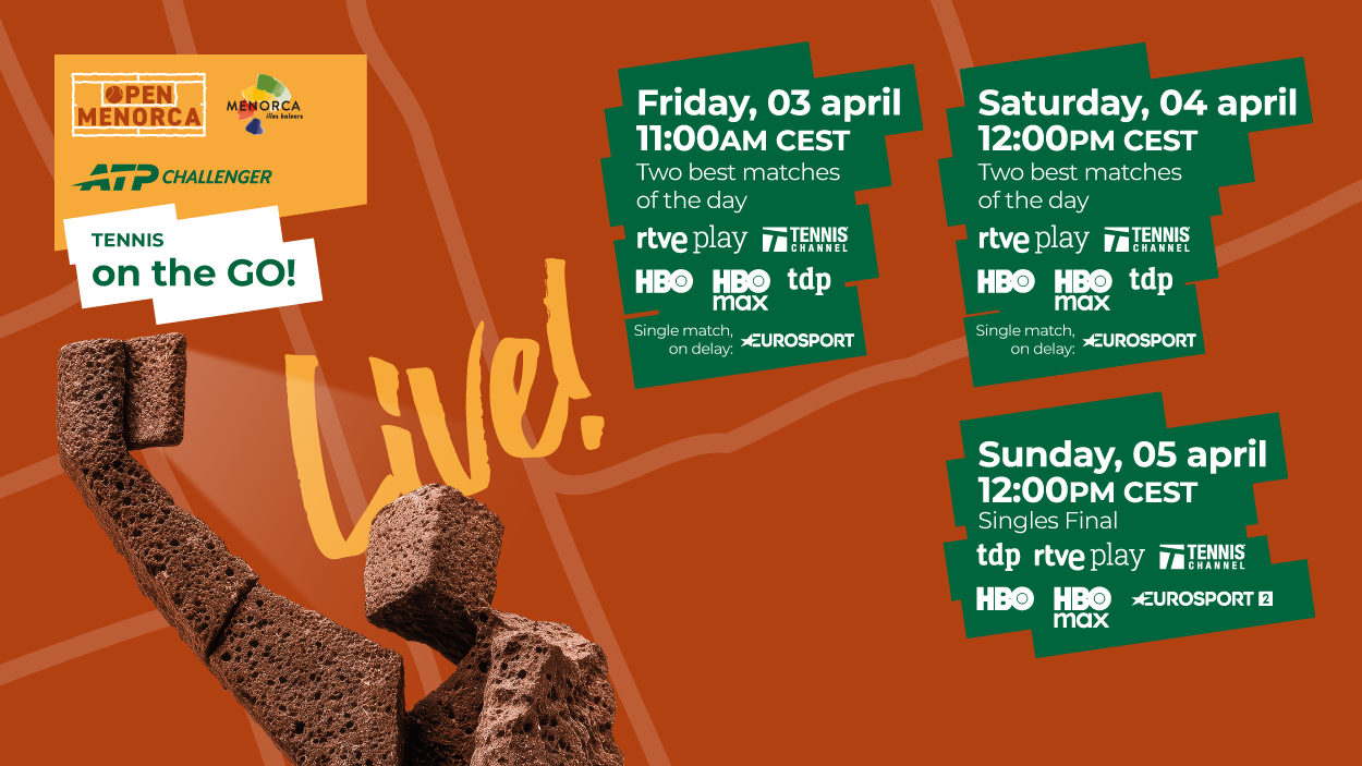 Eurosport, Tennis Channel, HBO, Teledeporte y RTVE Play emitirán los partidos destacados del viernes y sábado, así como la final del domingo desde el Club Tenis Ciutadella