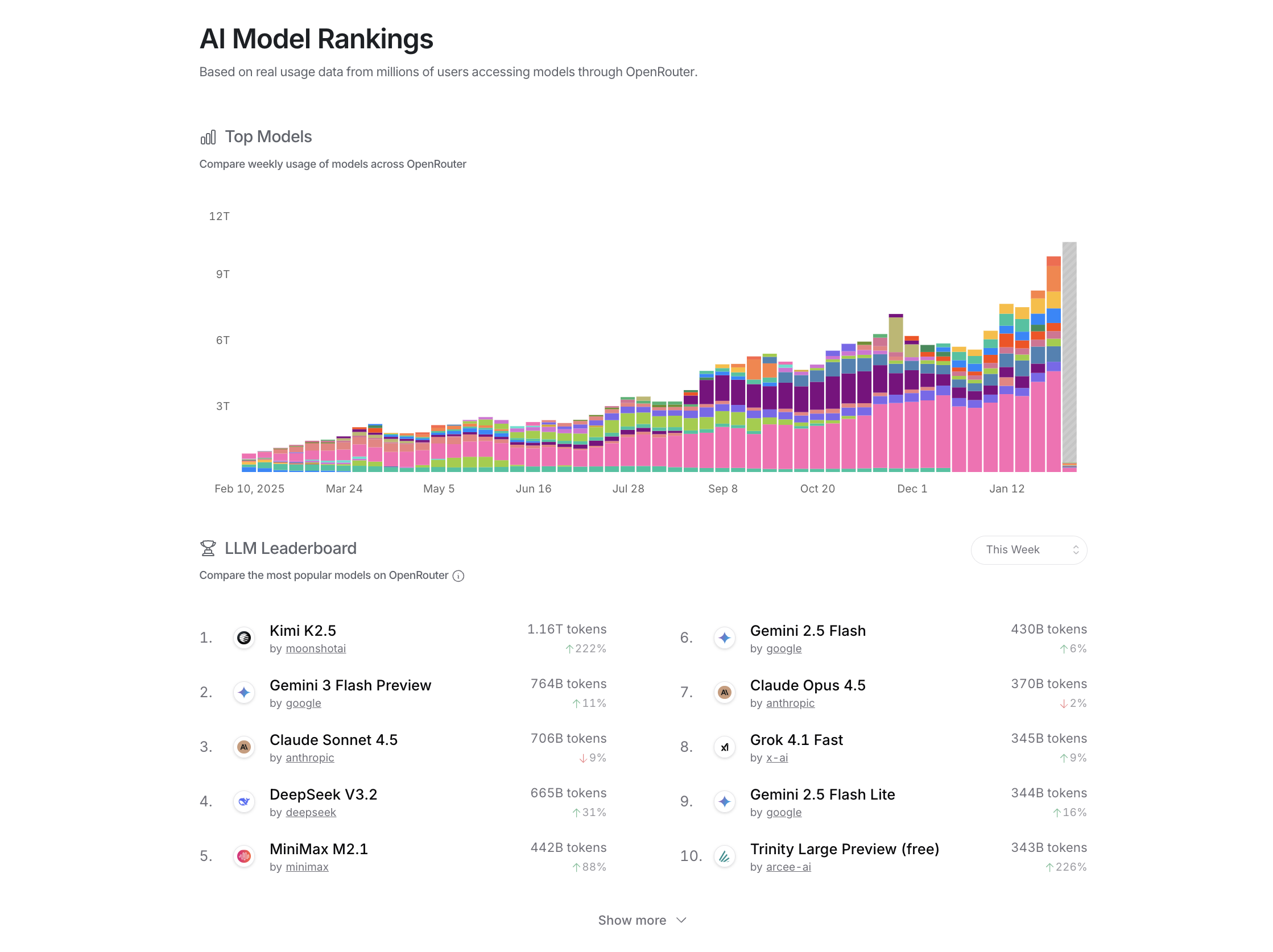 Kimi K2.5 ha mantenido el primer puesto en varios rankings de OpenRouter, incluyendo los de Modelos Top Semanales, Programación, Llamadas a Herramientas y uso específico en Python. Destaca especialmente en el ranking general semanal —el indicador más fiable de la demanda de modelos—, donde alcanzó los 1.16 billones de tokens, superando ampliamente a competidores de código cerrado como Gemini 3 Flash Preview y Claude Sonnet 4.5, con una ventaja superior al 50%.
