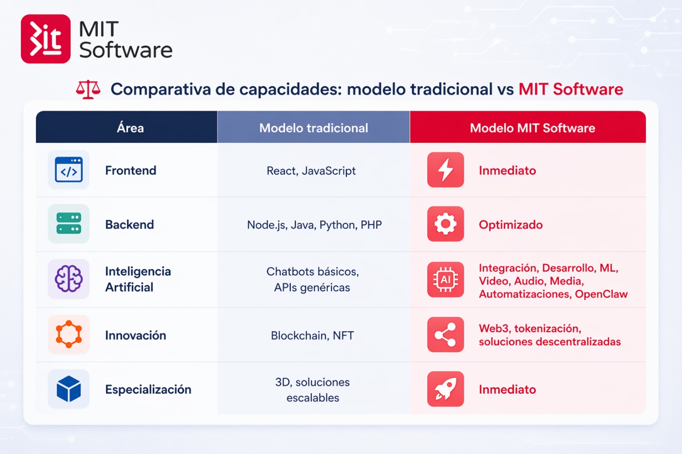 MiT Software ofrece un modelo integral que combina desarrollo tecnológico, integración de talento y adopción de tecnologías avanzadas. El enfoque permite implementar soluciones ágiles, optimizar recursos y acelerar proyectos estratégicos.